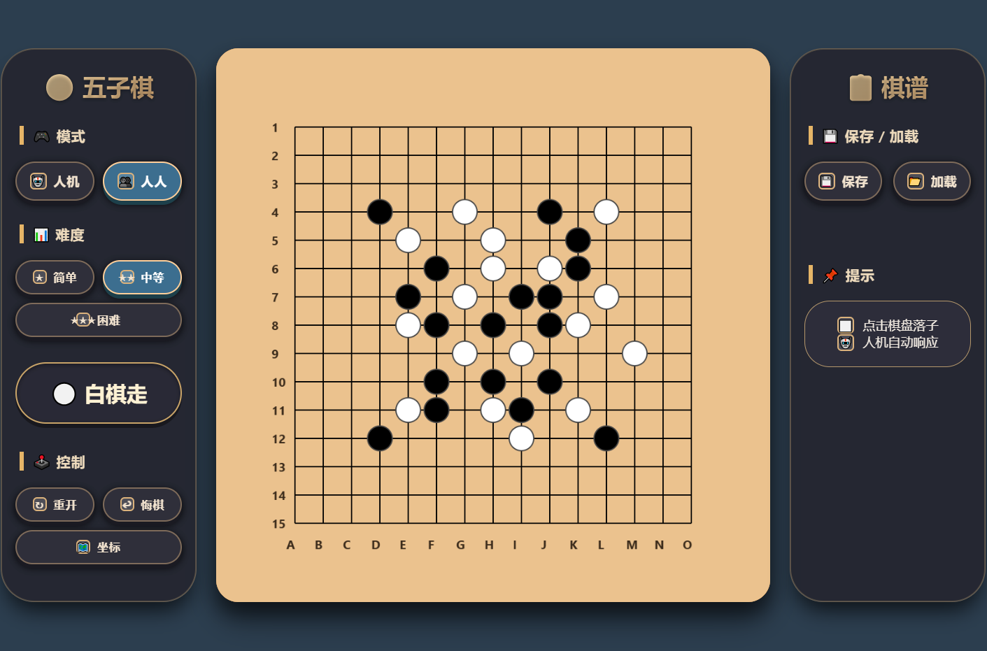 保存/加载棋谱:支持将棋局保存为 JSON 文件,并加载复盘