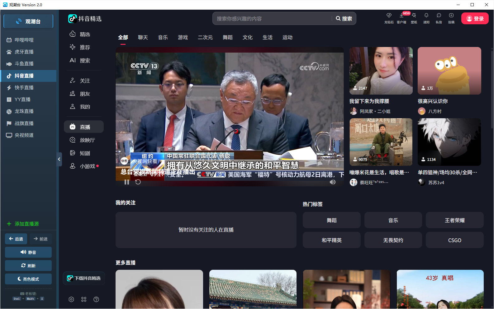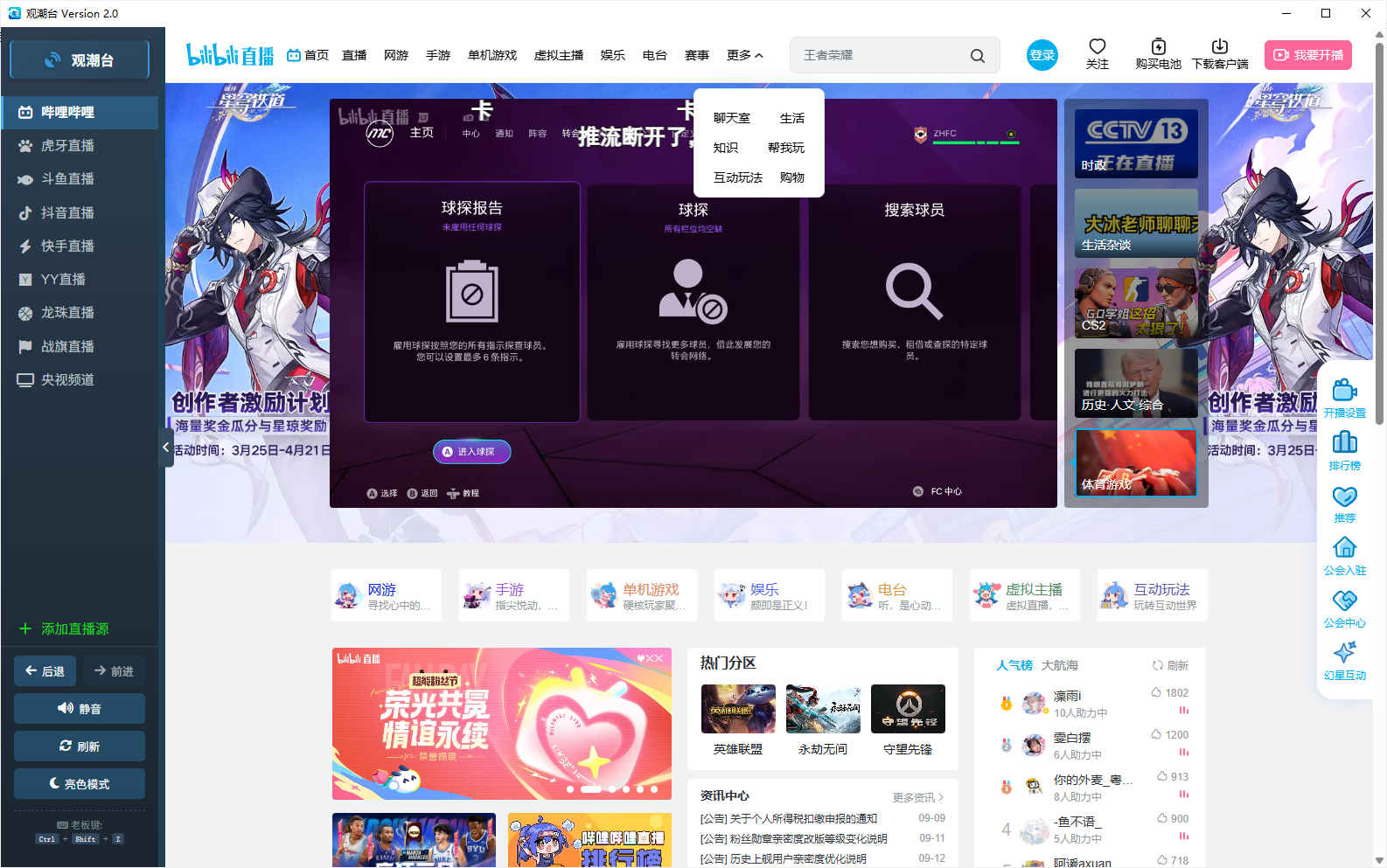 支持B站、虎牙、斗鱼、抖音、快手、YY、龙珠、战旗等主流直播平台,界面简洁,操作简单,多分区推荐,直播内容一目了然!适合喜欢看游戏、娱乐、虚拟主播的小伙伴,功能齐全,直播、游戏、娱乐、电台、赛事、聊天室全都有,省心省力!无需安装下载即用!